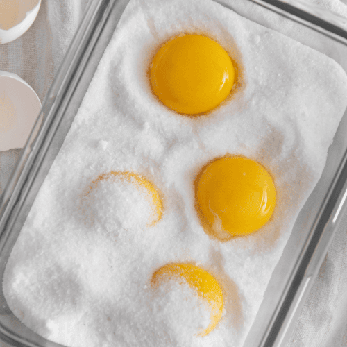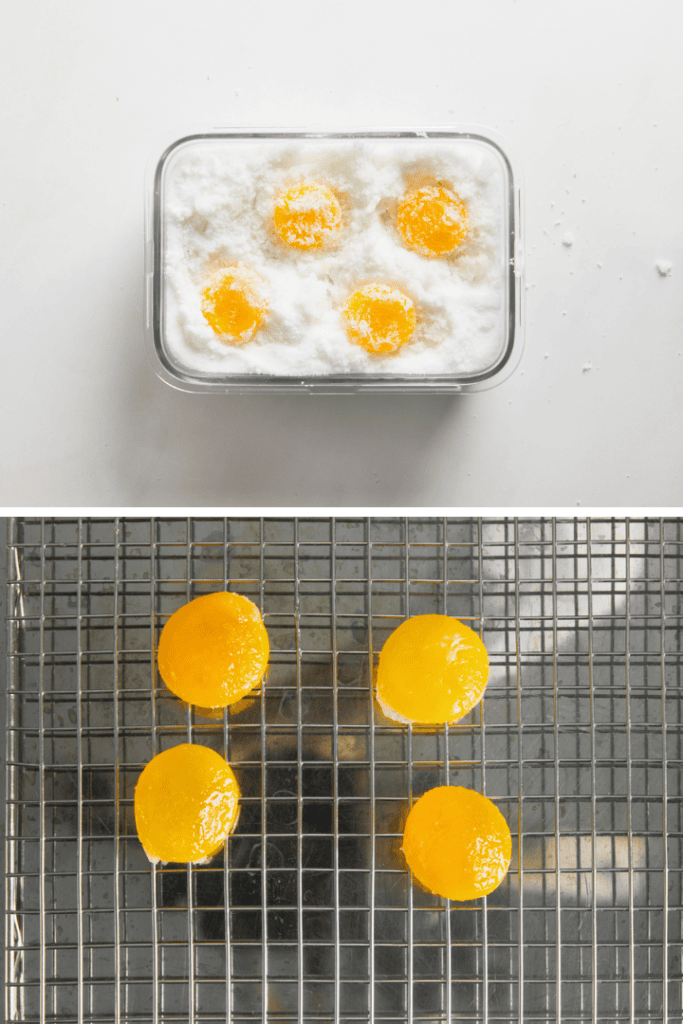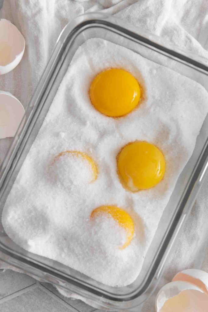 Vermenge Salz und Zucker gründlich. Gib ⅔ der Mischung in ein Gefäß, dass du mit einem Deckel verschließen kannst. Forme 4 Mulden und gib jeweils 1 Eigelb hinein. Bedecke die Eigelb gründlich mit der restlichen Salz und Zucker Mischung. Decke die Eigelb zu und lass sie für 5 Tage im Kühlschrank ruhen.