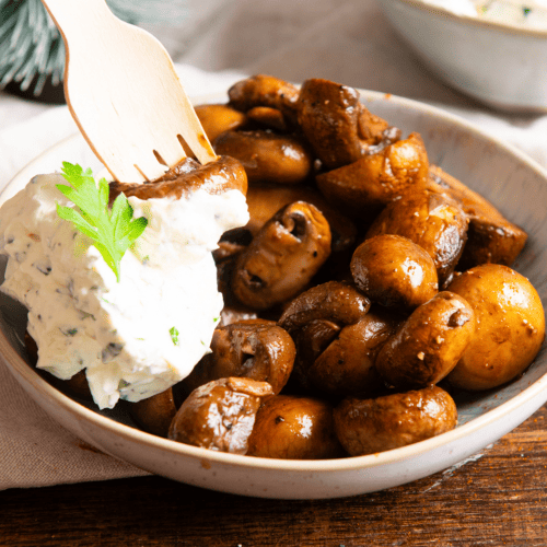 Schnelles und einfaches Rezept für gebratene Champignons wie vom Weihnachtsmarkt. Serviert mit der cremigsten Knoblauchsoße, holst du dir mit diesem Rezept das Weihnachtsmarkt-Feeling nach Hause.