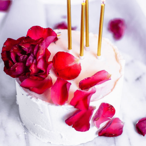 Geburtstagskuchen dann mit der finalen Schicht Creme einstreichen und glatt streichen. Mit Rose, Rosenblättern und Geburtstagskerzen dekorieren und bis zum servieren im Kühlschrank lagern.