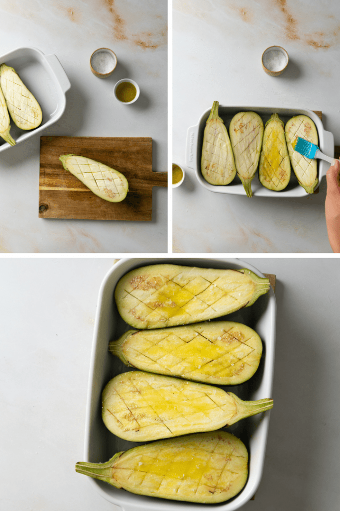 Backofen auf 170 °C Ober- und Unterhitze vorheizen. Die Auberginen waschen, der länge nach halbieren und jeweils kreuzweise einschneiden. Mit Olivenöl bestreichen und mit Salz bestreuen. im vorgeheizten Backofen bei 170 °C Ober- und Unterhitze etwa 20 Minuten backen.