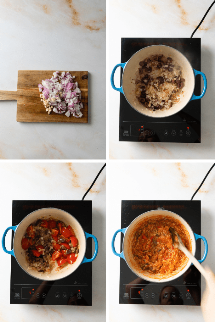 Für die Füllung, Risoni in Salzwasser nach Packungsangabe kochen. Derweil Zwiebeln und Knoblauch hacken, Tomaten vierteln, Oliven in Scheibchen schneiden. Zwiebel und Knoblauch in einer Pfanne mit etwas Olivenöl glasig dünsten. Dann die geviertelten Kirschtomaten dazu geben. Oliven und passierte Tomaten dazu geben. Die gekochten Risoni unterrühren. Mit Salz und Pfeffer abschmecken.