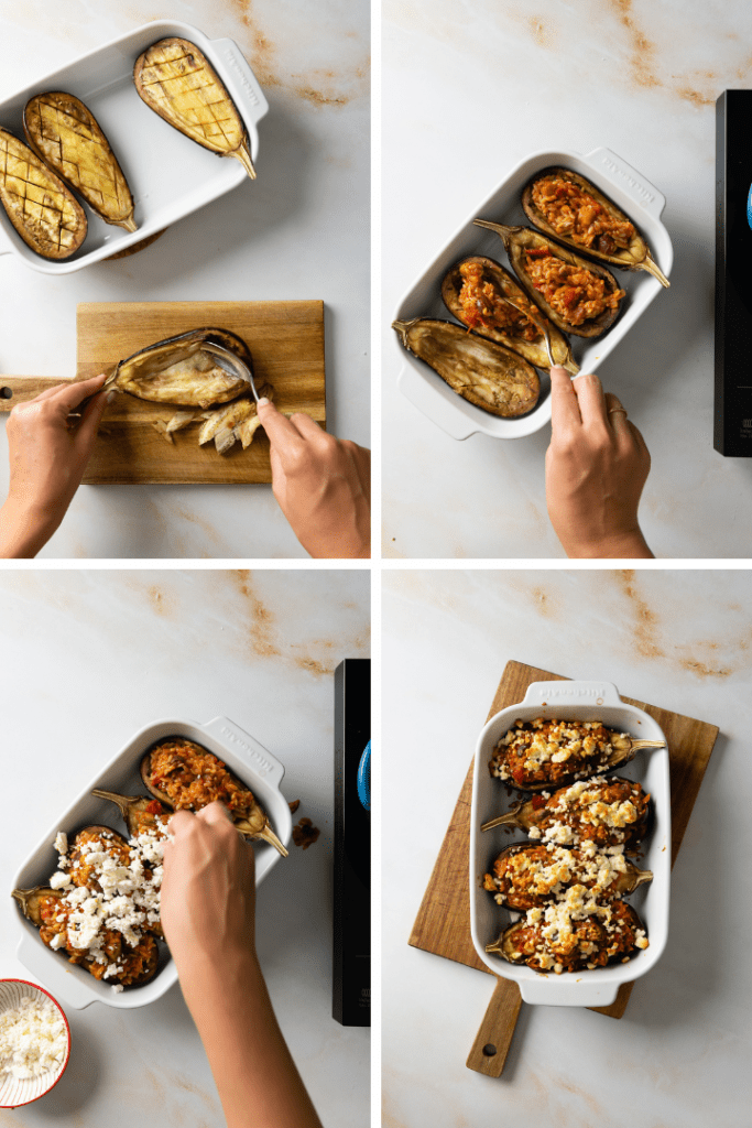Die Auberginen aus dem Ofen holen, mit einem Löffel vorsichtig das Fruchtfleisch heraus schaben. Grob hacken und mit zur Füllung geben. Erneut abschmecken, dann die Füllung auf die Auberginen verteilen. Auberginen wieder in die Auflaufform setzen, Feta darüber zerkrümeln. Gefüllte Auberginen nochmal für 20 Minuten bei 170 °C Ober- und Unterhitze im Backofen garen. Mit Salat oder einer anderen Beilage servieren.