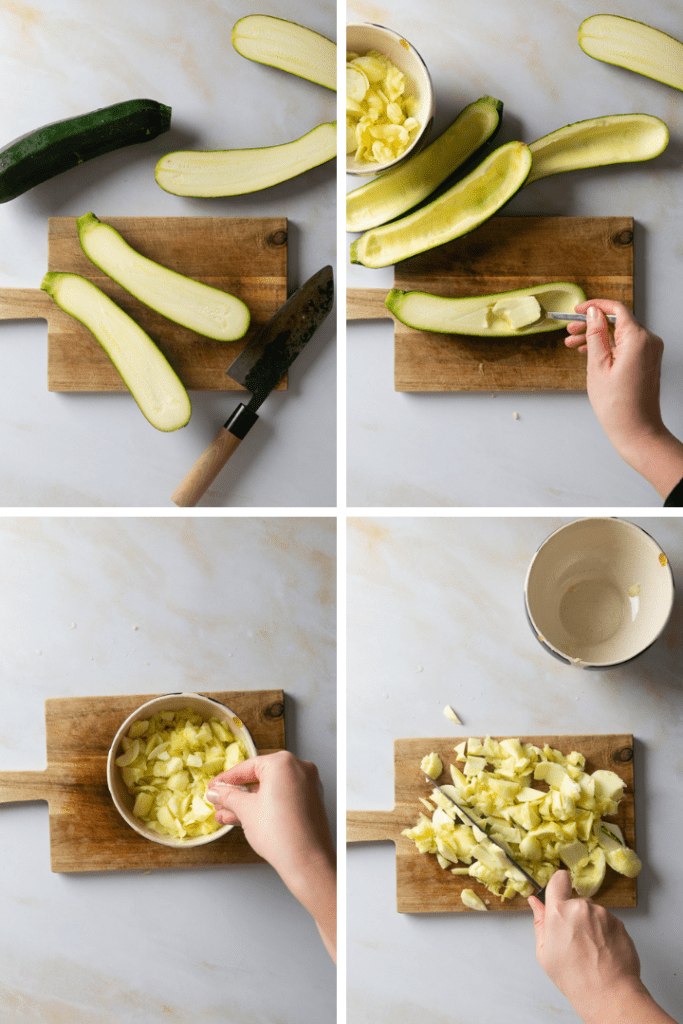 Backofen auf 170 °C Ober- und Unterhitze vorheizen. Zucchini längs halbieren und das Kerngehäuse mit einem Löffel herausschaben. Grob hacken und mit Salz in einer Schüssel vermengen. Etwa 10 Minuten stehen lassen.