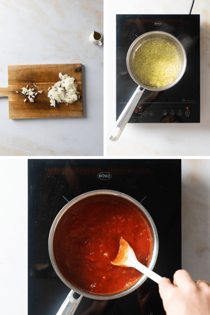 Derweil Tomatensoße zubereiten. Zwiebel und Knoblauch fein hacken. Olivenöl in einem Topf erwärmen und Zwiebeln und Knoblauch darin glasig dünsten. Dosentomaten dazu geben, die Tomaten ggf. vorher zerdrücken. Etwa 10 Minuten köcheln lassen und dann mit Salz und Pfeffer abschmecken.