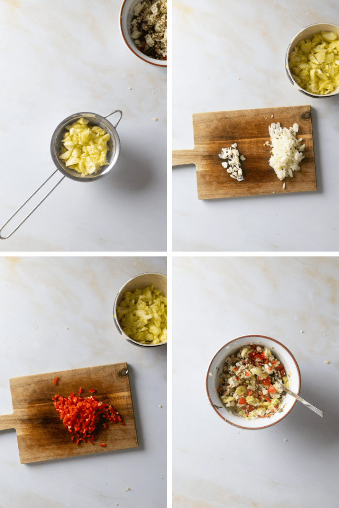 Die Zucchini-Kerngehäuse in ein Sieb geben und ausdrücken. Zwiebeln und Knoblauch fein hacken, Paprika und Tomaten in kleine Würfel schneiden. Alles in einer Schüssel vermengen. Oregano und fein gehackte Petersilie dazugeben. Den Großteil des Fetas in kleine Würfel schneiden und ebenfalls zur Füllung geben. Wer mag, gibt jetzt noch etwas Chiliflocken zur Füllung und mischt sie nun gut durch.
