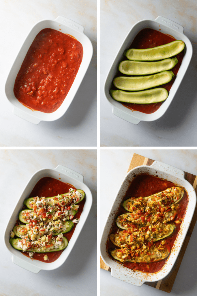 Die Tomatensoße in eine Auflaufform geben. Die Zucchini-Hälften hineinlegen und mit der Füllung bestücken. Den übrigen Feta darüber zerkrümeln. Zucchinis nun im vorgeheizten Backofen bei 170 °C Ober- und Unterhitze für etwa 40 Minuten garen, bis die Füllung goldbraun ist und die Tomatensoße blubbert. Gefüllte Zucchini mit frischem Focaccia oder Baguette servieren.