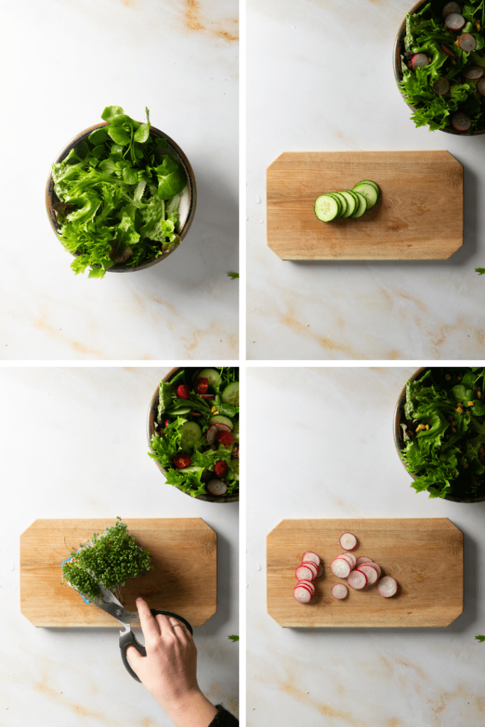 Salat gründlich waschen und mit einem Sieb oder einer Salatschleuder trocknen. Radieschen, Tomaten, Gurke und Zwiebel in mundgerechte Stücke/Ringe/Viertel schneiden. Den Mais abgießen und kurz abwaschen.