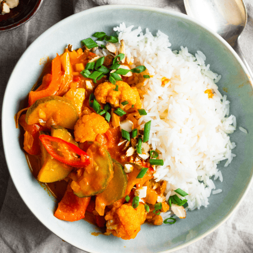 Gemüse Curry vegan: Wenn Du für das Rezept pflanzliche Sahne verwendest, ist das Rezept vegan. Sehr lecker ist Cashewsahne aber auch Sojasahne schmeckt sehr lecker. Du bekommst pflanzliche Sahne in der Regel im Kühlregal dort wo auch pflanzliche Milch und pflanzlicher Joghurt steht.