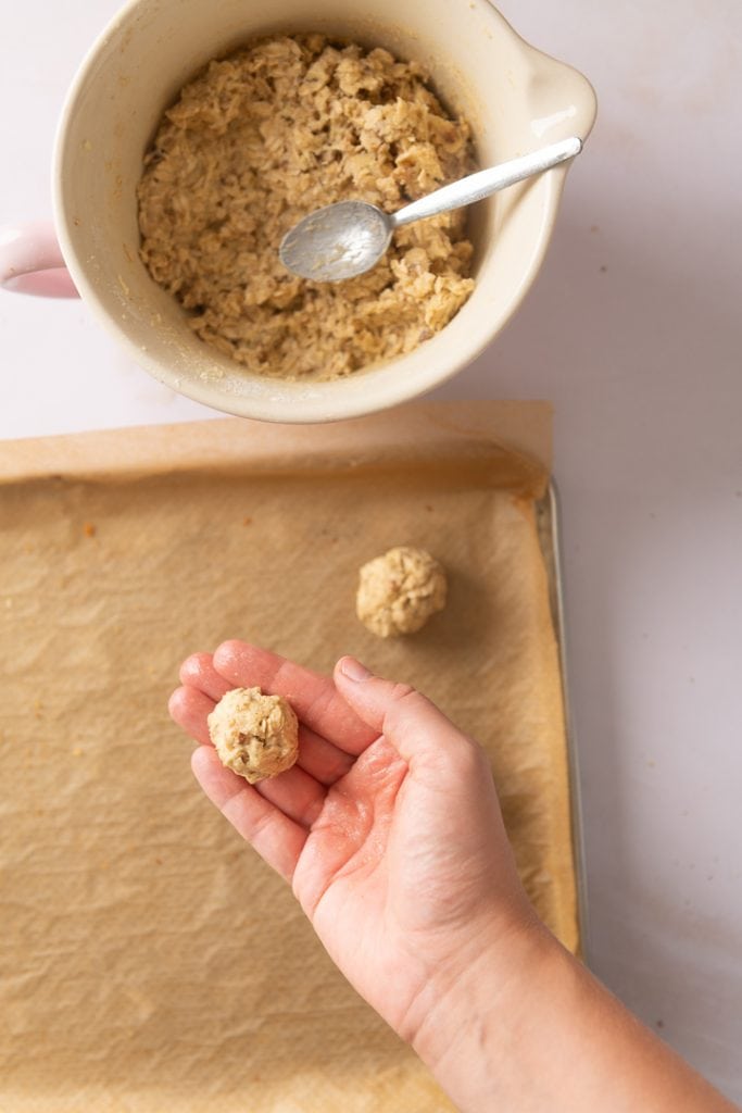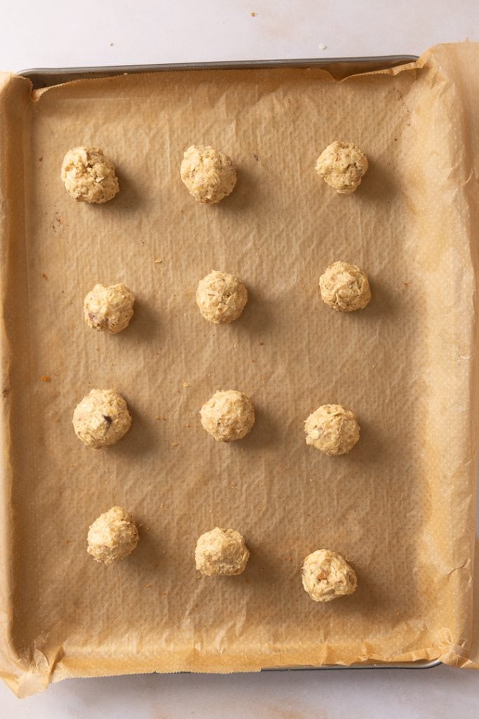 Portioniere den Teig in etwa walnussgroße Portionen und rolle sie zu Kugeln. Lege diese Kugeln auf ein Backblech mit Backpapier.