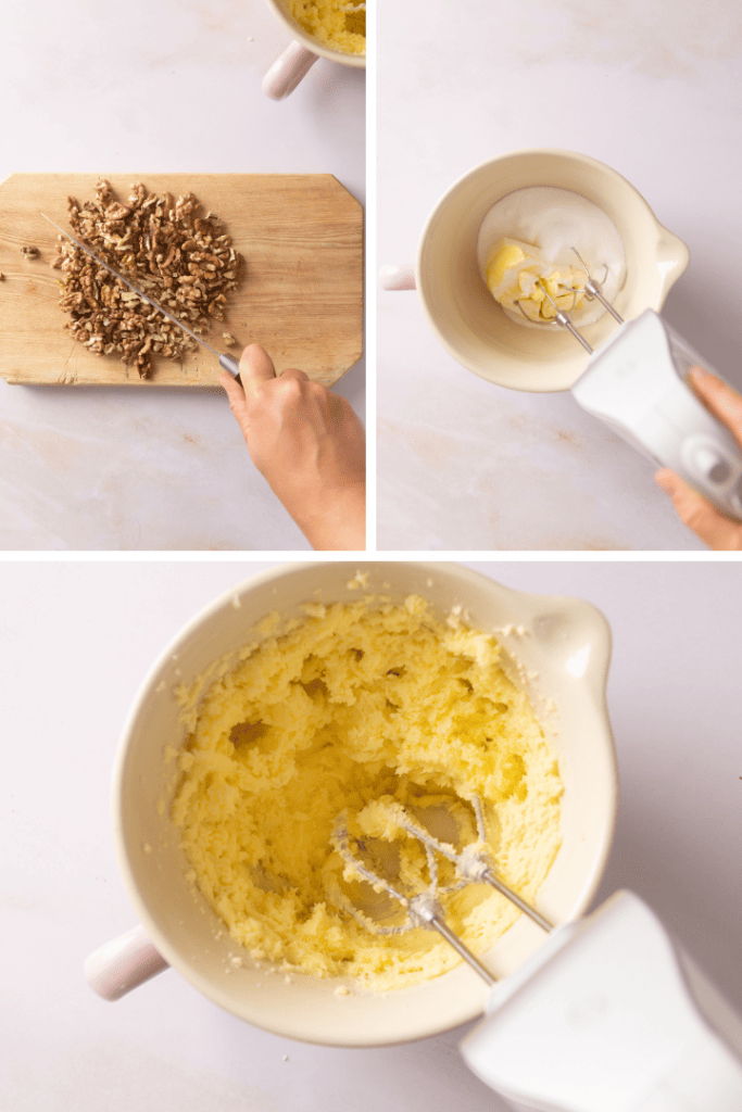 Hacke die Walnüsse grob. Gib Butter, Zucker, Salz, Vanilleextrakt und Zimt in eine Rührschüssel und rühre die Zutaten kurz cremig. Ein Handrührgerät oder Schneebesen ist ausreichend dafür.