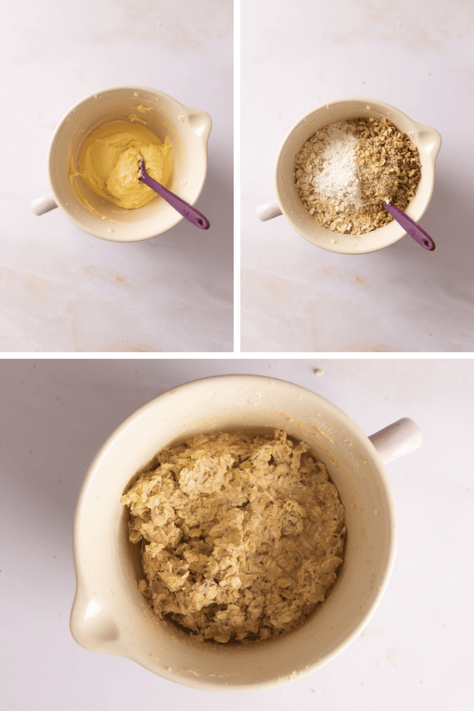 Rühre das Ei unter und gib Haferflocken, Mehl und die Walnusskerne dazu. Rühre alle Zutaten gründlich unter und lass den Teig für 15-30 Minuten bei Raumtemperatur ziehen.