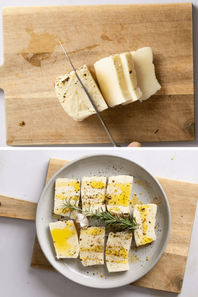 Schneide den Halloumi in etwa 1 cm dicke Scheiben. Vermenge Olivenöl, Rosmarin, Chili und die gehackte Knoblauchzehe mit Salz und Pfeffer und mariniere den Halloumi mindestens 30 Minuten damit.