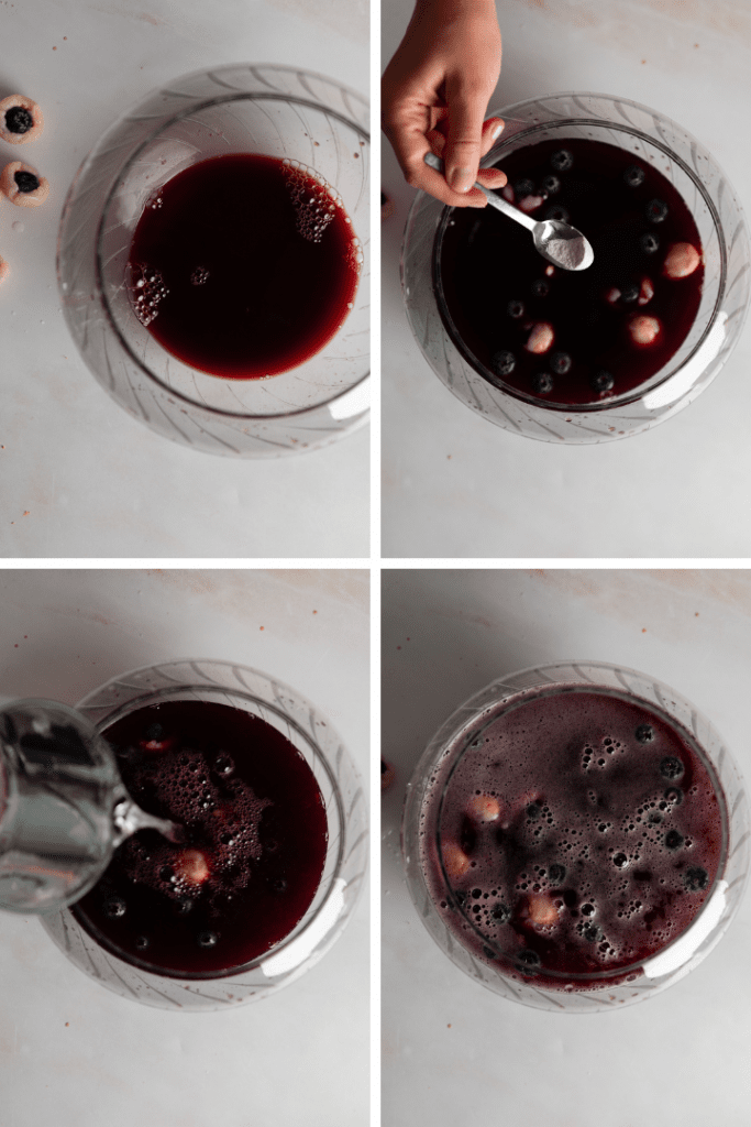 Nun die Säfte und das Wasser in das Bowlegefäß geben, umrühren und nach Wunsch essbaren Glitzer hinzuzufügen. Bowle bis zum Servieren in den Kühlschrank stellen. Wer mag, versieht sie später noch mit Eiswürfeln.