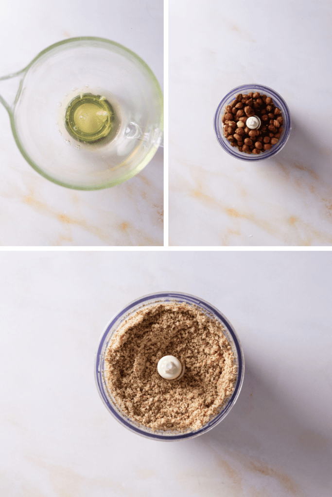 Schlage das Eiweiß steif. Sobald sich große Blasen bilden, gib nach und nach den Zucker dazu und schlage den Eischnee weiter auf, bis er steif ist und sich die Zuckerkristalle komplett aufgelöst haben. Mahle die Haselnüsse fein, falls du sie frisch mahlst. Sonst entfällt dieser Schritt.