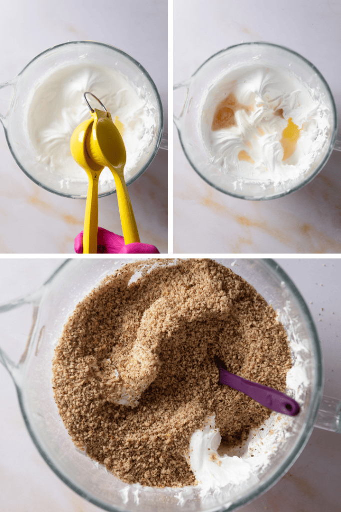Gib Zitronensaft, Vanilleextrakt und die gemahlenen Mandeln zum Eischnee und hebe alles gründlich unter.