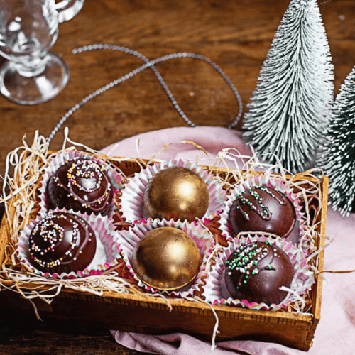 Schokoladen Halbkugeln dann aus der Form befreien. Eine Kante der ersten Halbkugel kurz auf einem warmen Teller anschmelzen um sie zu begradigen. Halbkugel mit etwas Trinkschokolade, Mini-Marshmallows, Erdnussbutter oder Minzschokolade füllen. Die obere Halbkugel aufsetzen. Kante ebenfalls kurz anschmelzen. Kugel vorsichtig zusammen setzen. Eierbecher helfen hier bei der Stabilisierung.