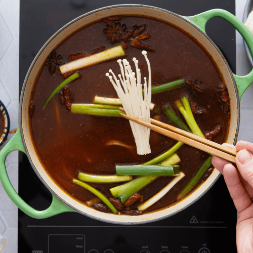 Wenn du die scharfe Brühe zubereiten willst, gib einfach zusätzlich die Zutaten für die scharfe Brühe mit dazu.