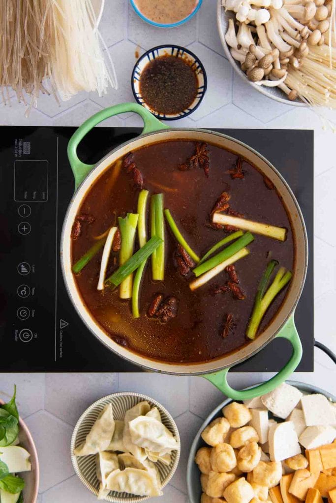 Du kannst das Hotpot Rezept gut vorbereiten und die Brühe bereits bis zu 2 Tage im Voraus zubereiten. Gieße sie ab und füge vor dem Servieren einfach nochmal frische Frühlingszwiebeln für die Optik hinzu.