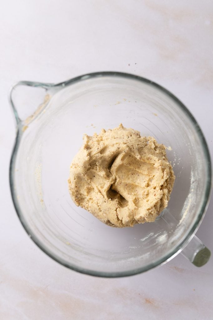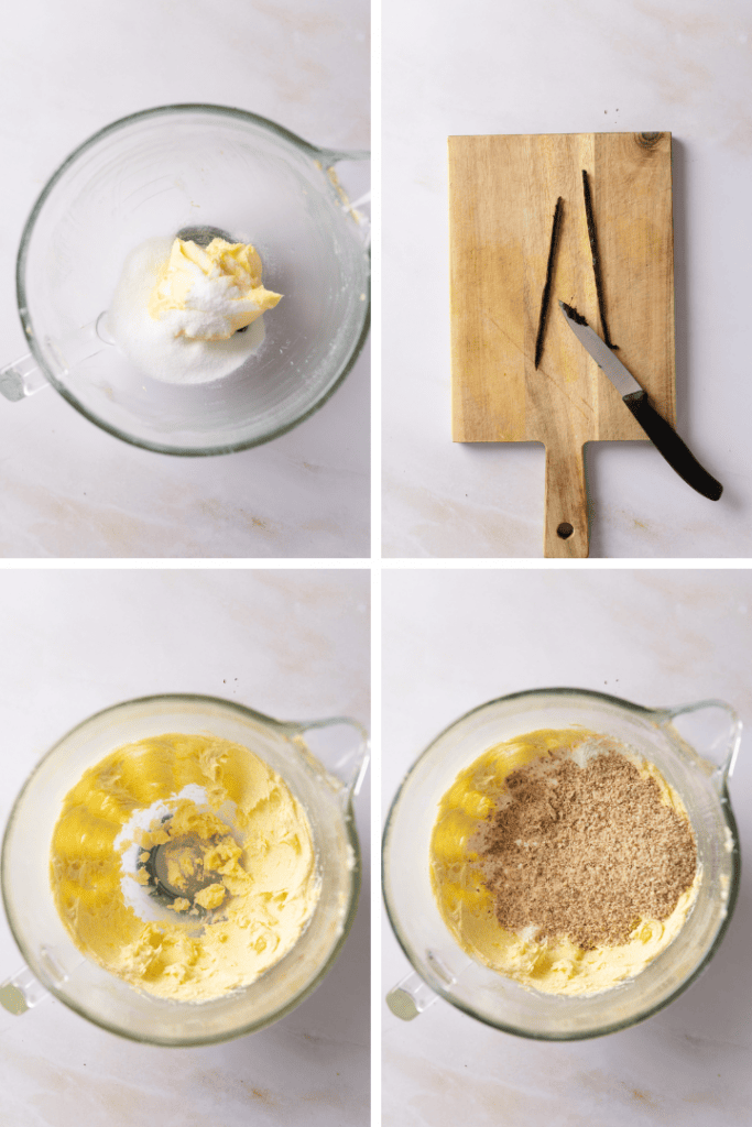Gib Butter, Zucker und Salz in eine große Rührschüssel und vermenge sie kurz. Kratze das Mark der Vanilleschote aus und gib es zusammen mit Mehl und gemahlenen Mandeln zur Butter. Vermenge alle Zutaten kurz zu einem glatten Teig.