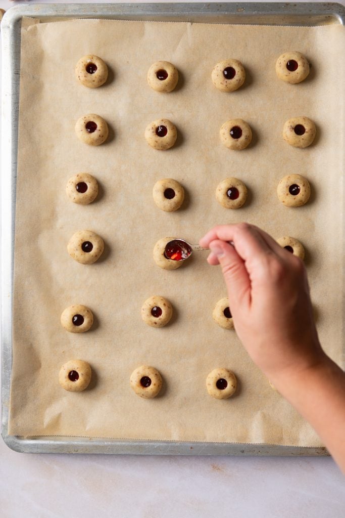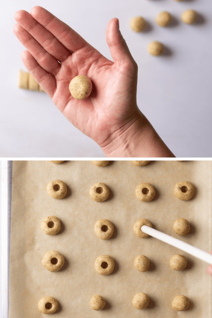 Rolle die Teigportionen jeweils zu einer Kugel und lege sie auf ein Backblech mit Backpapier. Stich mit dem Stiel eines Kochlöffels eine Mulde in jede Kugel. Achte darauf, nicht ganz durch zu stechen.