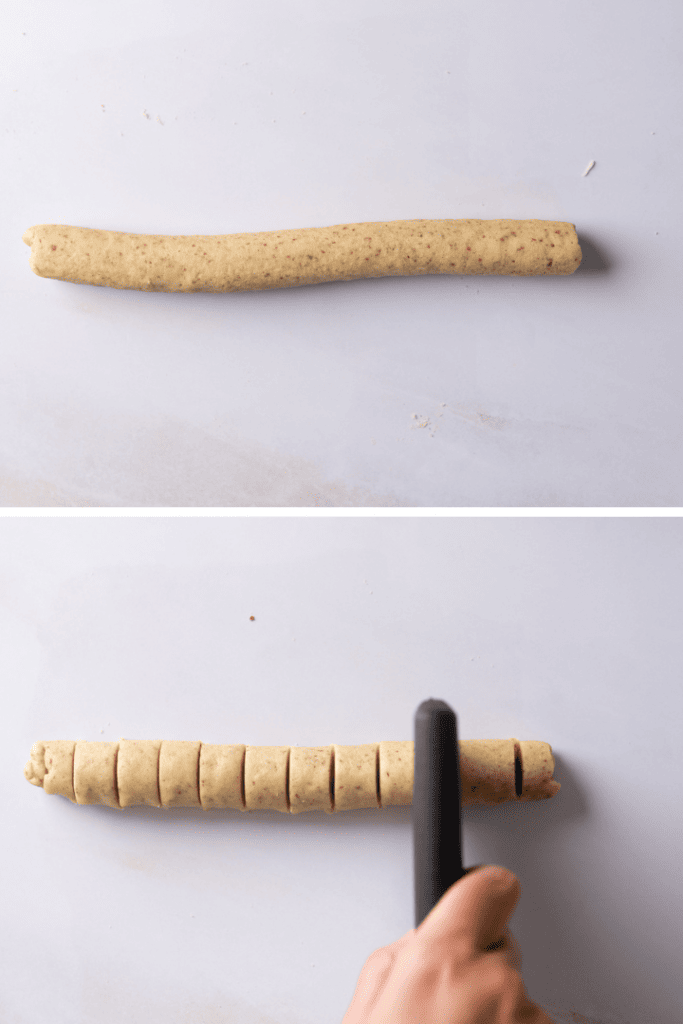 Heize den Backofen auf 170 °C Ober- und Unterhitze vor. Rolle den Teig nach dem Kühlen zu Teigsträngen, die etwa den Durchmesser einer Euromünze haben. Unterteile die Teigstränge in etwa 1,5 cm große Stücke.