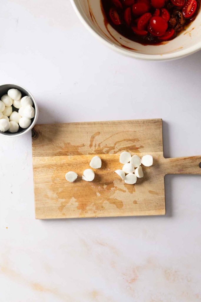 Hacke die getrockneten Tomaten grob und halbiere die Mozzarella Bällchen. Koche die Nudeln nach Packungsangabe al dente.