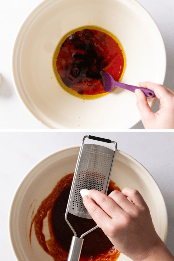 Bringen in einem Topf ausreichend Wasser für die Nudeln zum Kochen. Vermenge die Zutaten für das Dressing in einer großen Schüssel gründlich und reibe ggf. die Knoblauchzehe dazu.