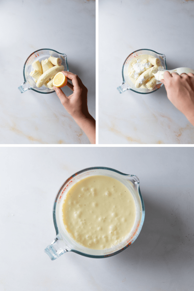 Schäle die Bananen, schneide sie in Stücke und beträufle sie mit Zitronensaft. Gib Puderzucker, Schlagsahne und Milch dazu und püriere die Zutaten gründlich.