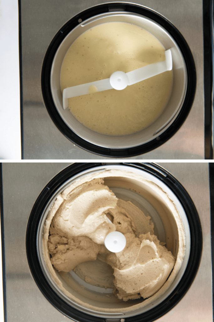 Fülle die Masse in die Eismaschine und lass sie dort 20-30 Minuten lang gefrieren. Du kannst das Bananeneis dann direkt servieren, oder du füllst es um und stellst es kurz ins Gefrierfach, damit es etwas fester wird.