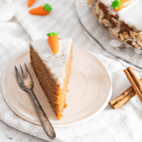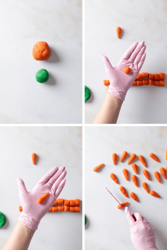 Kuchen nach dem Backen komplett abkühlen lassen. Der weil die Marizpankarotten vorbereiten. 3/4 des Marzipans Orange einfärben. Das restliche Marzipan grün färben. Sollte das Marizpan durch die Farbe zu klebrig werden, kann etwas Marizpan eingeknetet werden. Das orangeneMarzipan zu einer Wurst rollen und in 16 gleich große Teile teilen. Jeder Portion zu einer Karotte formen und mit einem Messerrücken waagerechte Linien in die Karotte prägen.