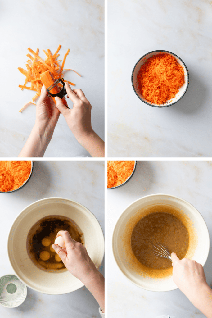 Karotten raspeln und in einer Schüssel mit Eier und Öl vermischen. In einer anderen Schüssel Mehl, Nüsse, Zucker, Salz und Zimt vermischen.