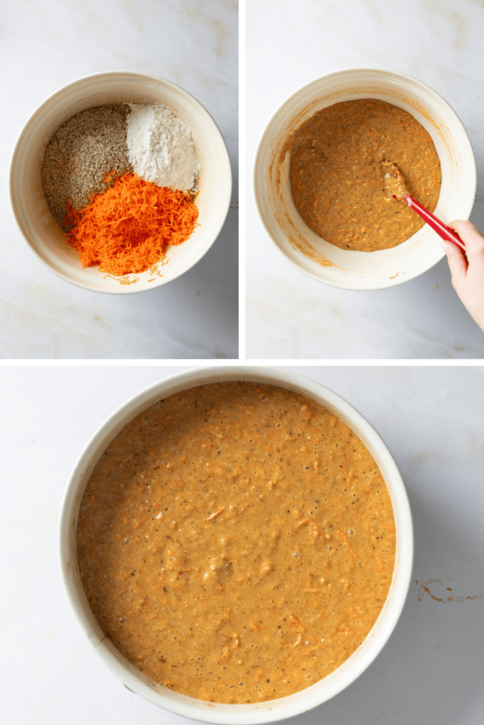 Dann die trockenen Zutaten zur Karottenmischung geben und so lange vermengen, bis ein glatter Teig entstanden ist. Den Teig in die vorbereitete Form geben und bei 170 °C Ober- und Unterhitze für ca. 50 Minuten backen. Mit der Stäbchenprobe den Garpunkt prüfen.