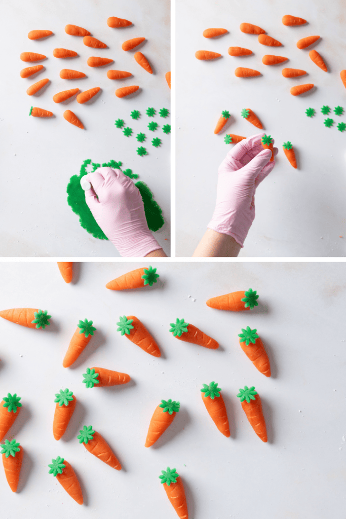 Das grüne Marzipan ausrollen und mit einem Schneeflocken- oder Blütenausstecher 16 Teile als Karottengrün ausstechen. Je ein Karottengrün in das breite Ende der Marzipankarotten kleben. Etwas Wasser hilft, falls das Karottengrün zu trocken ist.