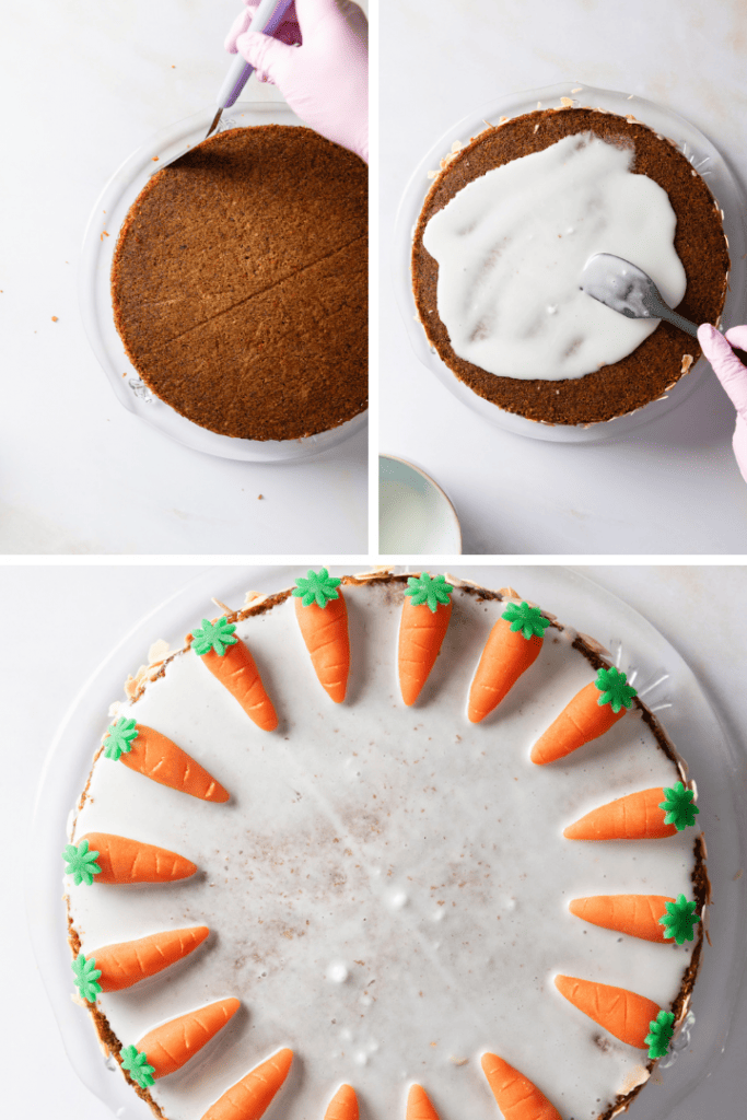 Den Rand des abgekühlten Kuchens dünn mit Aprikosenmarmelade bestreichen und mit Mandelblättchen bekleben. Für die Glasur das Eiweiß nach und nach mit den 150 g Puderzucker vermengen, bis eine sämige Glasur entstanden ist. Glasur auf dem Kuchen verteilen und bis zum Rand hin verstreichen. Die Karotten auf den Kuchen legen.