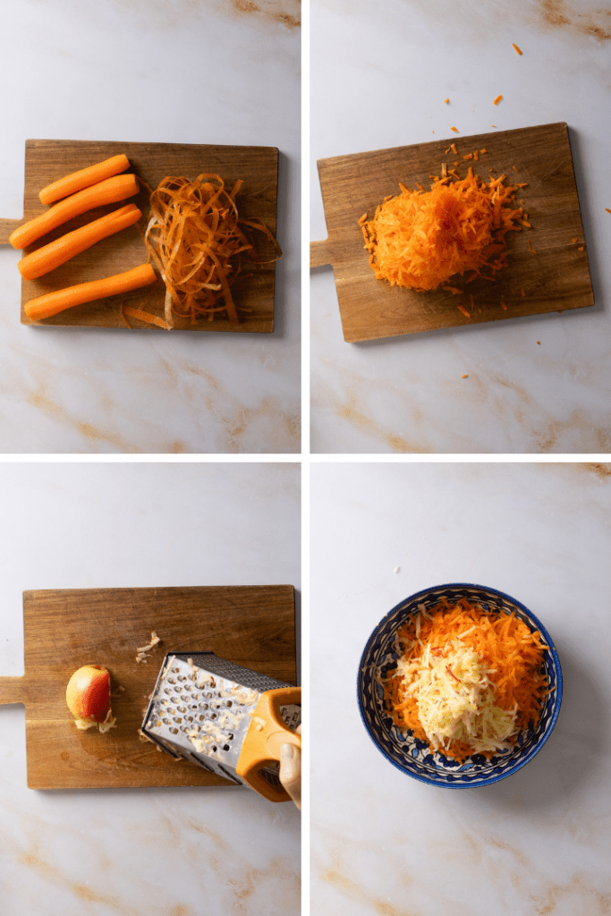 Karotten schälen, vom Strunk befreien und grob raspeln. Apfel gründlich waschen und ebenfalls raspeln.