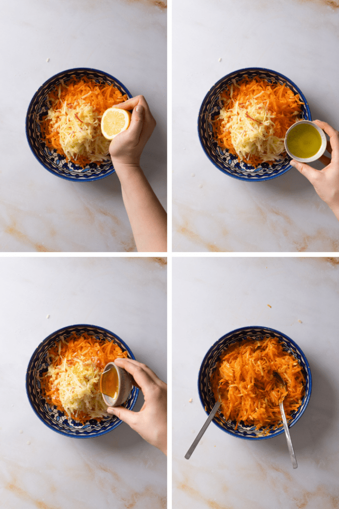Karotten- und Apfelraspel in eine Schüssel geben. mit Honig, Zitronensaft und Olivenöl beträufeln und durchmischen. Salat mit Salz und Pfeffer abschmecken. Etwa 10 Minuten ziehen lassen, ggf. nachwürzen und servieren.
