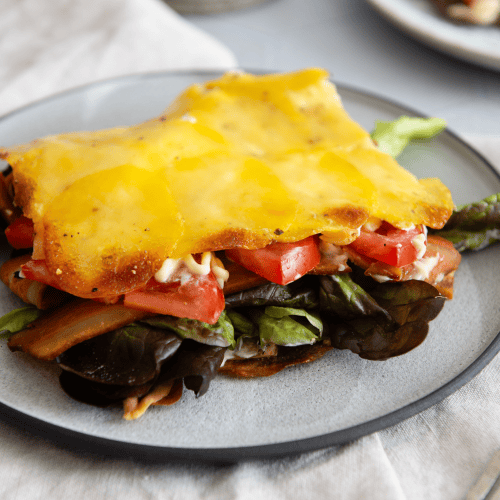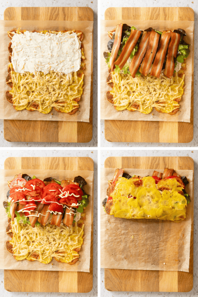 Nimm den Wrap vom Blech und belege ihn mit Frischkäse, Salat, Tomatenscheiben, Bacon und Mayonnaise und würze ihn mit Salz und Pfeffer.