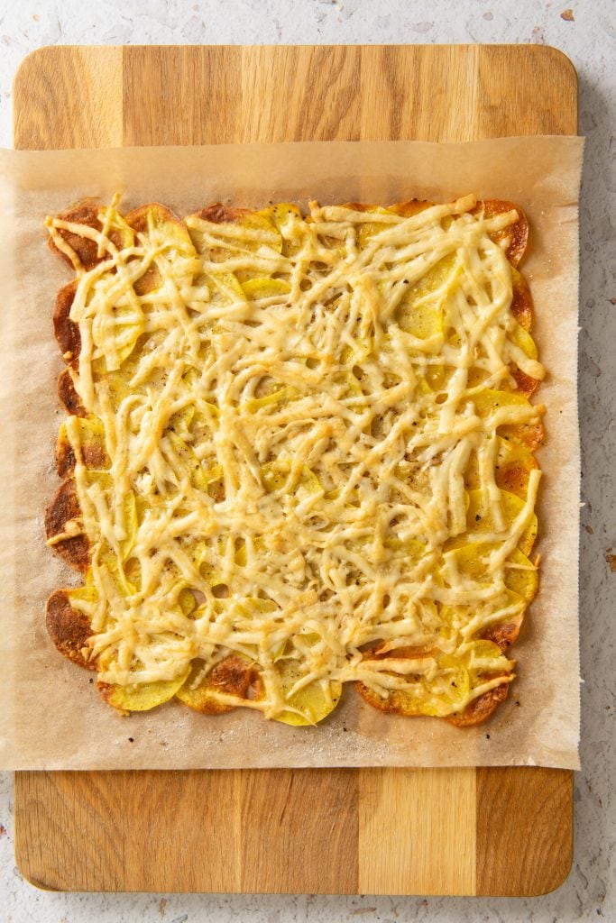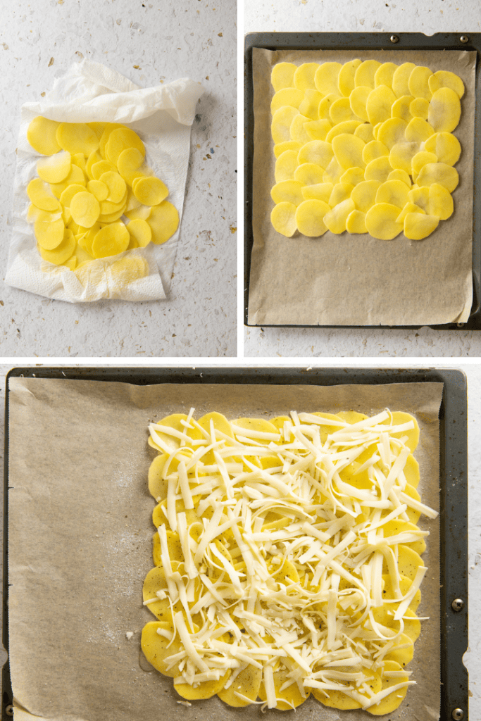 Tupfe die Kartoffelscheiben trocken. Verteile das Olivenöl auf dem Backpapier und lege die Kartoffelscheiben auf das Blech, sodass sie leicht überlappen. Würze mit Salz und Pfeffer und streue den geriebenen Käse darüber.
