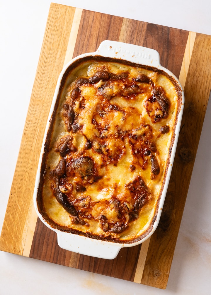 Backe das Kartoffelgratin bei 170 °C Ober- und Unterhitze für ca. 1 Stunde, bis es goldbraun ist und die Kartoffeln weich sind, wenn du mit einem scharfen Messer hinein stichst.Serviere das Kartoffelgratin mit gemischtem Salat, als Beilage zu Fisch, Fleisch oder Gemüse.