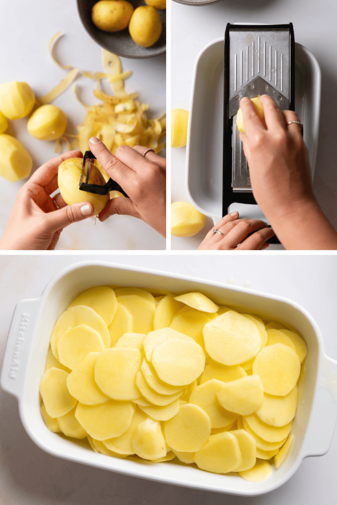 Heize den Backofen auf 170 °C Ober- und Unterhitze vor. Pinsle eine Auflaufform mit Butter aus. Schäle die Kartoffel und hoble sie mit einem Küchenhobel in etwa 3 mm dicke Scheiben. Schichte diese Scheiben in eine Auflaufform.