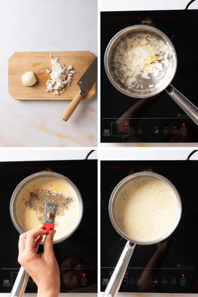 Schneide Zwiebeln und Knoblauch in feine Würfel. Erhitze einen TL Butter in einem Topf und brate Zwiebeln und Knoblauch darin an, bis sie glasig sind. Füge Schlagsahne und Milch hinzu und würze die Soße mit Muskatnuss, Salz und Pfeffer.