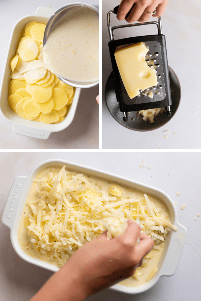 Gieße die Sahne-Mischung über die vorbereiteten Kartoffelscheiben. Reibe Emmentaler und Parmesan grob und streue den Käse über das Gratin.
