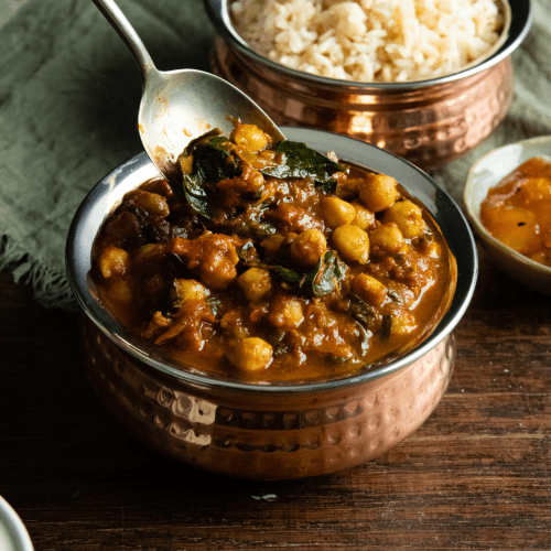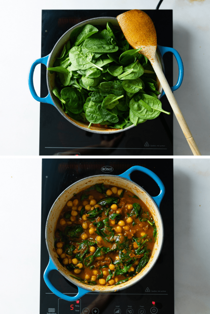 Leckeres Rezept für Kichererbsen Spinat Curry. Superlecker mit Naan oder fluffigem Reis ist dieses würzige, vegan Curry in wenigen Minuten fertig zubereitet.