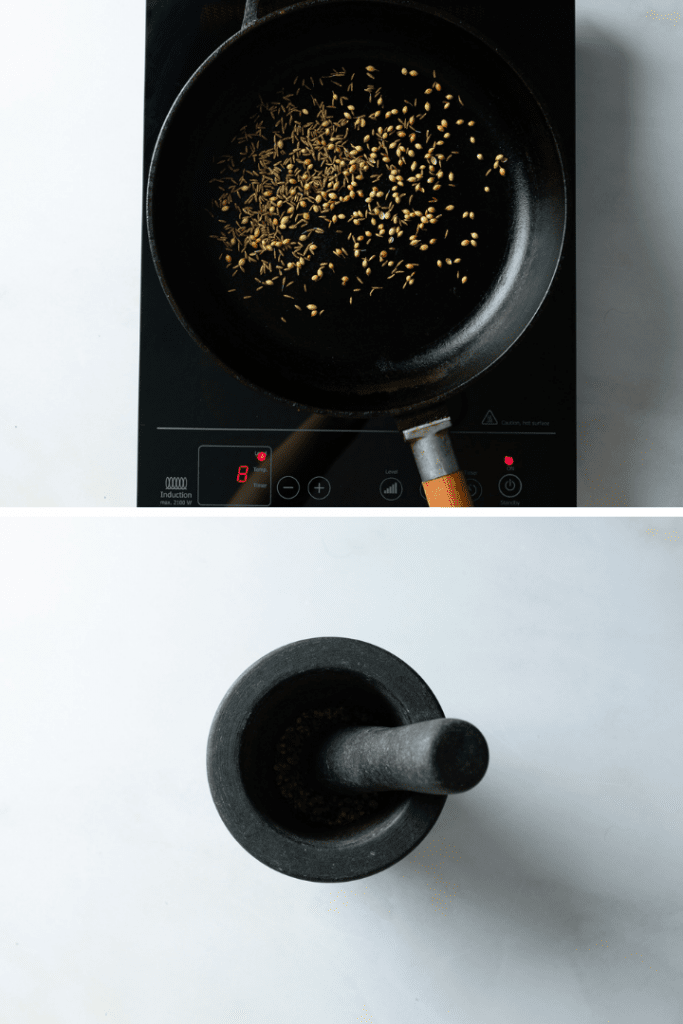 Koriandersaat und Kreuzkümmel in einer Pfanne ohne Öl rösten. Dann in einer Gewürzmühle oder einem Mörser fein mahlen. Garam Masala, Kurkuma und Chili dazugeben und zu einem Gewürzpulver vermengen.