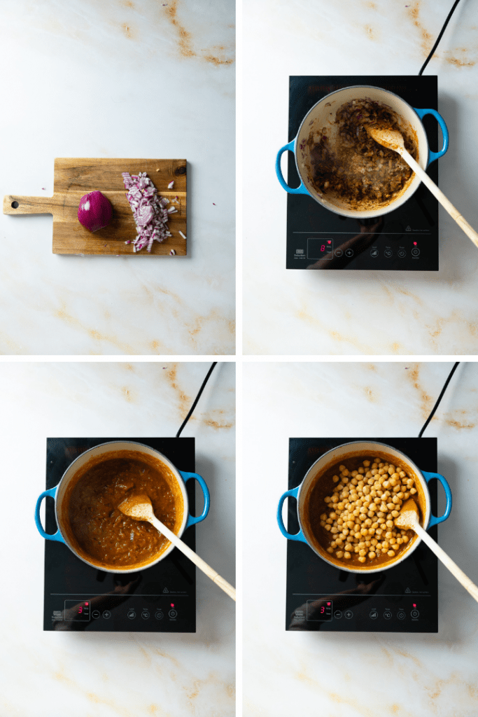 In einem Topf Öl erwärmen. Zwiebel in feine Würfel schneiden, Knoblauchzehe und Ingwer schälen und fein reiben. Dann zusammen mit Zwiebelwürfeln im heißen Öl kurz anbraten. Die Gewürze dazu geben. Kurz unterrühren, dann Kichererbsen und Tomaten dazu geben. Nach Bedarf noch etwas Wasser hinzufügen.