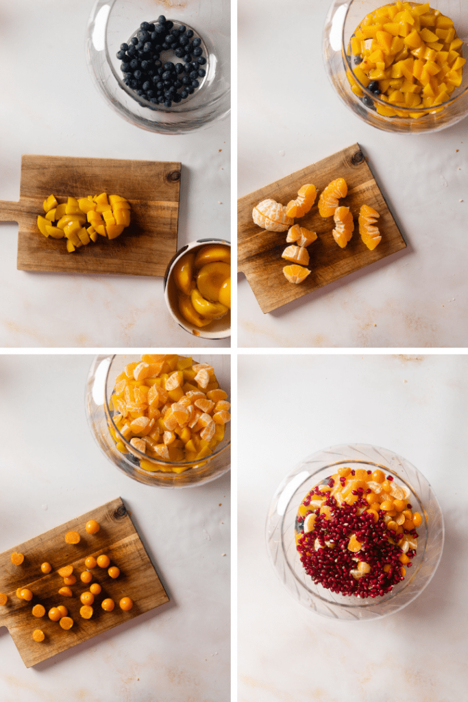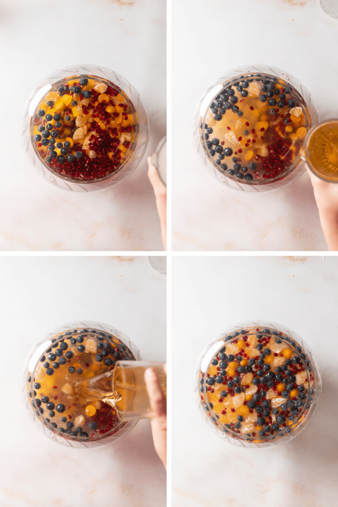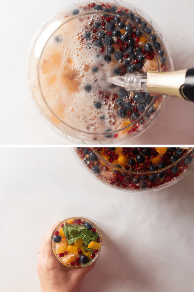 Pfirsiche und das restliche Obst in mundgerechte Stücke schneiden und in ein Bowlegefäß geben. Den Saft der Pfirsiche ebenfalls ins Bowleglas geben. Heidelbeeren und Granatapfelkerne dazugeben.