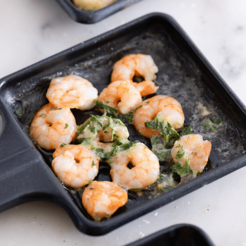 Lege einige Garnelen in dein Pfännchen. Gib einige Flocken Knoblauchbutter dazu und backe die Shrimps im Raclette, bis die Butter blubbert.