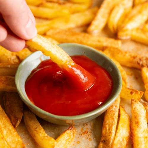 Knusprige Pommes im Ofen selber machen ist mit diesem Rezept ganz einfach! Du brauchst nur 3 Zutaten und 5 Minuten Zeit, den Rest erledigt der Backofen.