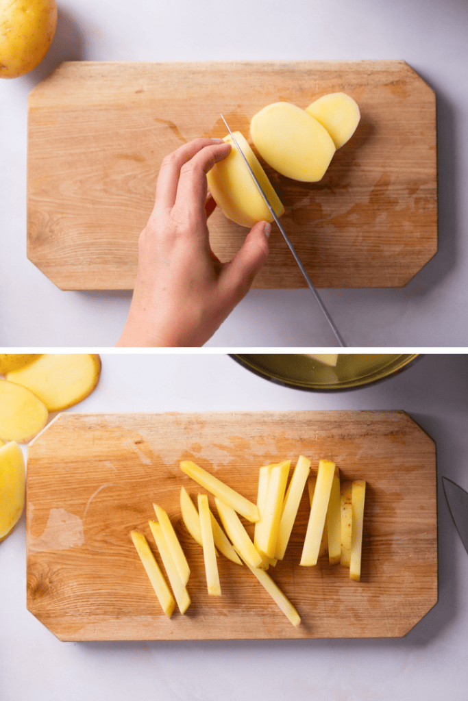 Kartoffeln in ca. 8 mm dicke Scheiben schneiden und dann in 8 mm breite Pommes.