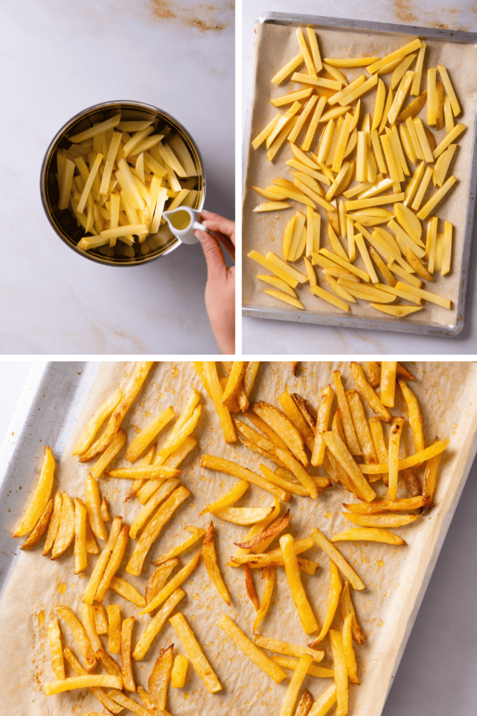 Pommes mit Öl beträufeln und gleichmäßig auf einem Backblech verteilen. Bei 180 °C Heißluft für 30-45 Minuten backen, bis die Pommes goldbraun sind. Nach 20 Minuten wenden.
